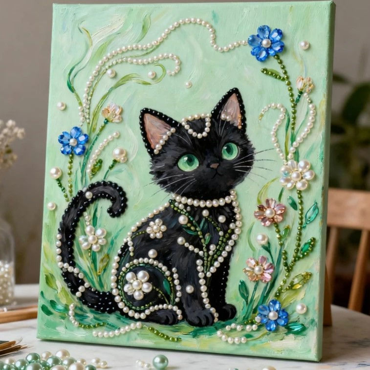 Black Cat Diamond Painting Kit | Pearl-Style Floral DIY Art